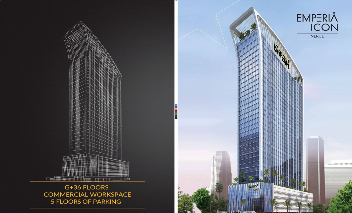 Emperia Icon, Nerul – a stunning G+36 storey commercial tower offering luxury offices and retail spaces designed for entrepreneurs, corporates, startups, and investors.