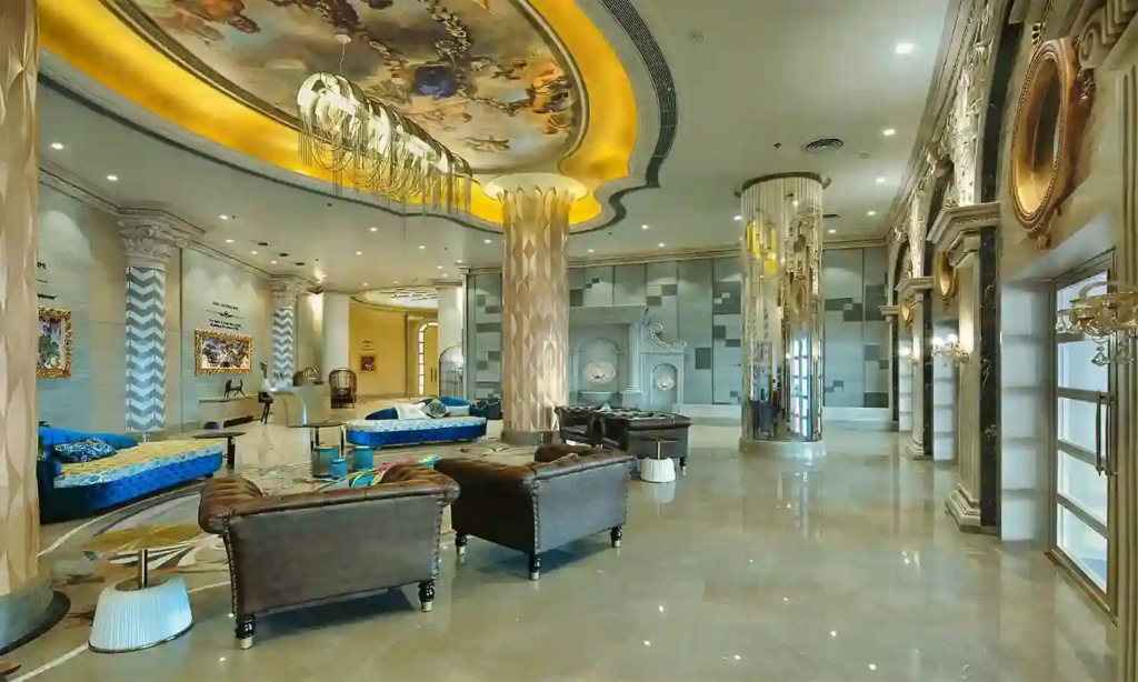 The use of high ceilings, decorative columns, artistic finishes, and premium materials gives the project a truly luxurious appeal.
